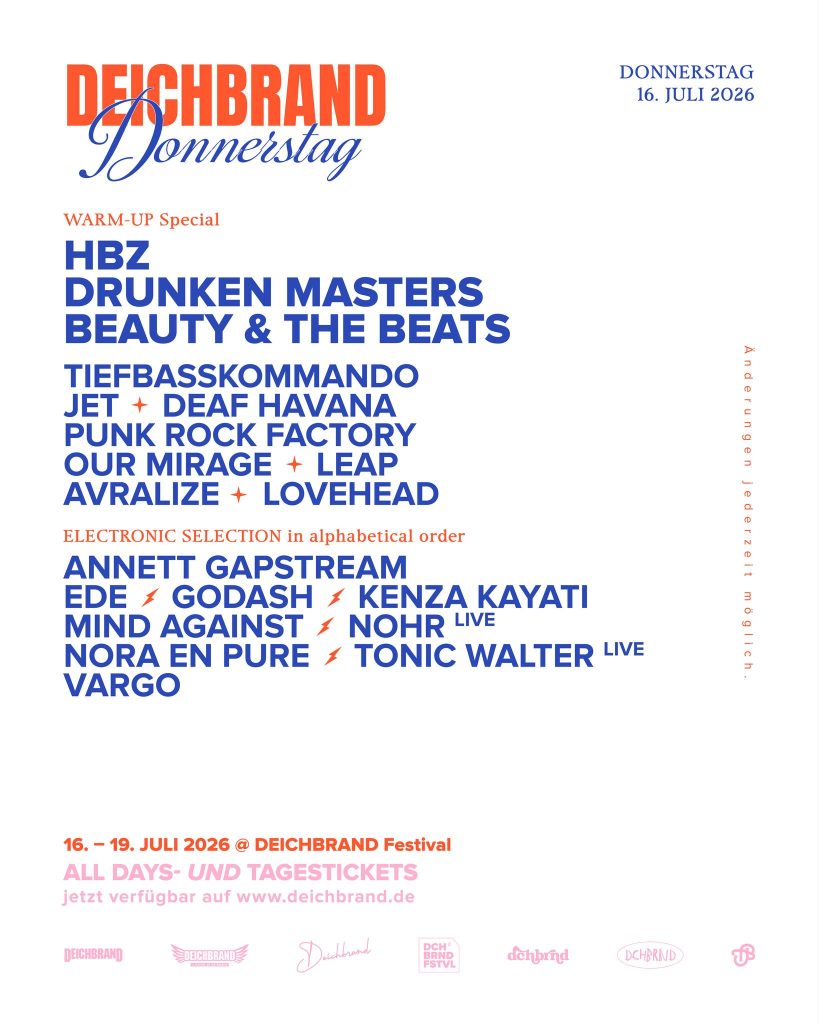 Wer auf das Deichbrand 2026 fährt und schon wissen will, an welchem Tag welcher Act spielt, kann ab sofort konkret planen: Das Festival an der Nordseeküste bei Cuxhaven/Nordholz hat die Tagesverteilung seines Line-ups veröffentlicht. Und wer nicht alle vier Tage dabei sein kann oder will, findet ab jetzt auch Tagestickets im Vorverkauf auf deichbrand.de.