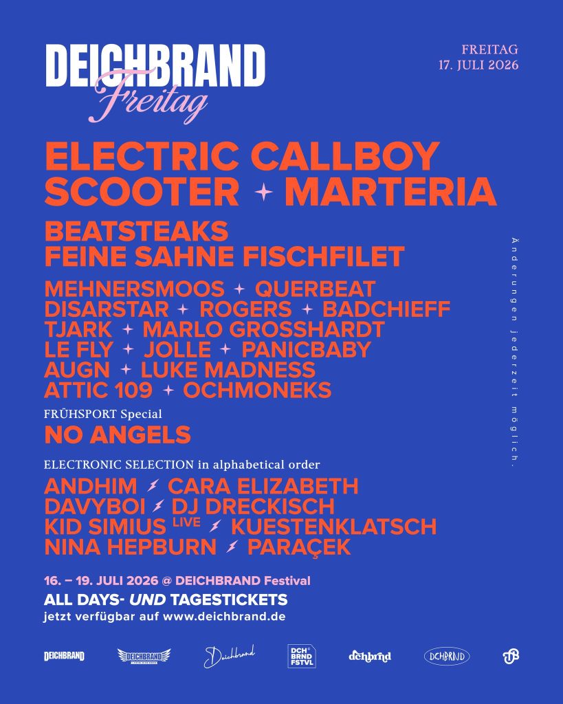 Der stärkste Tag nach Acts-Dichte. Electric Callboy, Scooter und Marteria headlinen den Freitag. Direkt dahinter stehen Beatsteaks und Feine Sahne Fischfilet. Das mittlere Feld hält mit Mehnersmoos, Querbeat, Disarstar, Rogers, Badchieff, Tjark, Marlo Grosshardt, Le Fly, Jolle, Panicbaby, Augn, Luke Madness, Attic 109 und Ochmoneks eine breite Mischung aus Deutschrap, Ska, Punk und Indie bereit.