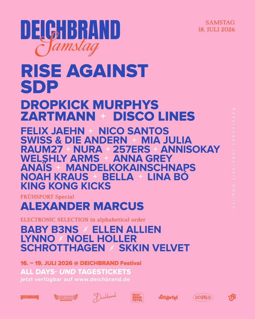 Rise Against und SDP teilen sich den Samstag an der Spitze. Direkt dahinter folgen Dropkick Murphys, Zartmann und Disco Lines. Das weitere Programm: Felix Jaehn, Nico Santos, Swiss & die Andern, Mia Julia, Raum27, Nura, 257ers, Annisokay, Welshly Arms, Anna Grey, Anaïs, Mandelkokainschnaps, Noah Kraus, Bella, Lina Bó und King Kong Kicks.