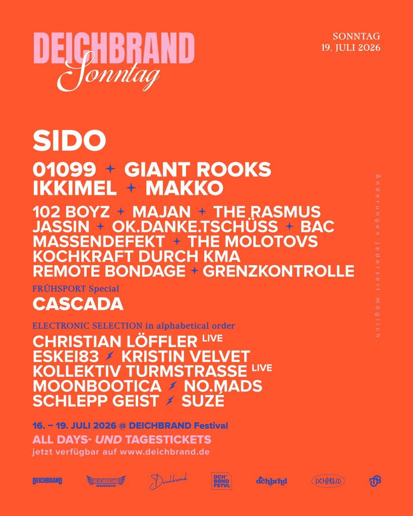 Sido schließt das Festival als Sonntags-Headliner ab. Dahinter: 01099, Giant Rooks, Ikkimel und Makko. Das weitere Programm: 102 Boyz, Majan, The Rasmus, Jassin, Ok.Danke.Tschüss, BAC, Massendefekt, The Molotovs, Kochkraft durch KMA, Remote Bondage, Grenzkontrolle.