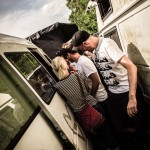 Am Backstageeingang werden Montreal schon erwartet. Der Bulli wird auf das Gelände durchgewunken. Doch während auf einmal neun Menschen dort herauskrabbeln und sich der Mercedes gefühlt wieder einen Halben Meter vom Untergrund erhebt, staunt der Veranstalter nicht schlecht. „Äh ja, sind doch ein paar mehr geworden.“ stammelt Bassist Hirsch vor sich hin. Der Veranstalter schluckt kurz und holt ein paar weitere Backstagepässe. Alles gut. In der Zwischenzeit hat sich Hirsch bereits über das Catering gestürzt und kommt mit einem selbstgebasteltem Burger in der Hand zurück um uns mit vollem Mund zu erklären, wo wir denn alle an etwas zu Kauen kommen.