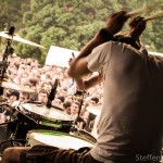 Gut, dass irgendwann auch mal Montreal auf der anderen Bühne beginnen zu spielen. Ich darf dem ganzen vom Bühnenrand beiwohnen. Interessante Perspektive, bekommt man hier doch so einiges mit, was dem restlichen Publikum meist verborgen bleibt. Vor allem einfache Blicke, welche sich die drei Bandmitglieder zwischendurch immer wieder zuwerfen zeigen, dass sich Montreal nach über Zehn Jahren ohne Worte verstehen.