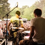 Alles geht schnell. 15 Minuten hat die Band nur Zeit bis auf der Hauptbühne die nächste Band ihren Krach loslässt. Vor der kleinen Bühne ist es gut gefüllt. In den letzten Tagen sprach es sich auf dem Festivalgelände rum, dass dort heute die drei Flitzpiepen aus Hamburg, die eigentlich gar nicht mehr aus Hamburg, sondern aus Berlin (verdammte Hipster!) kommen, ein kurzes Überraschungsset spielen.