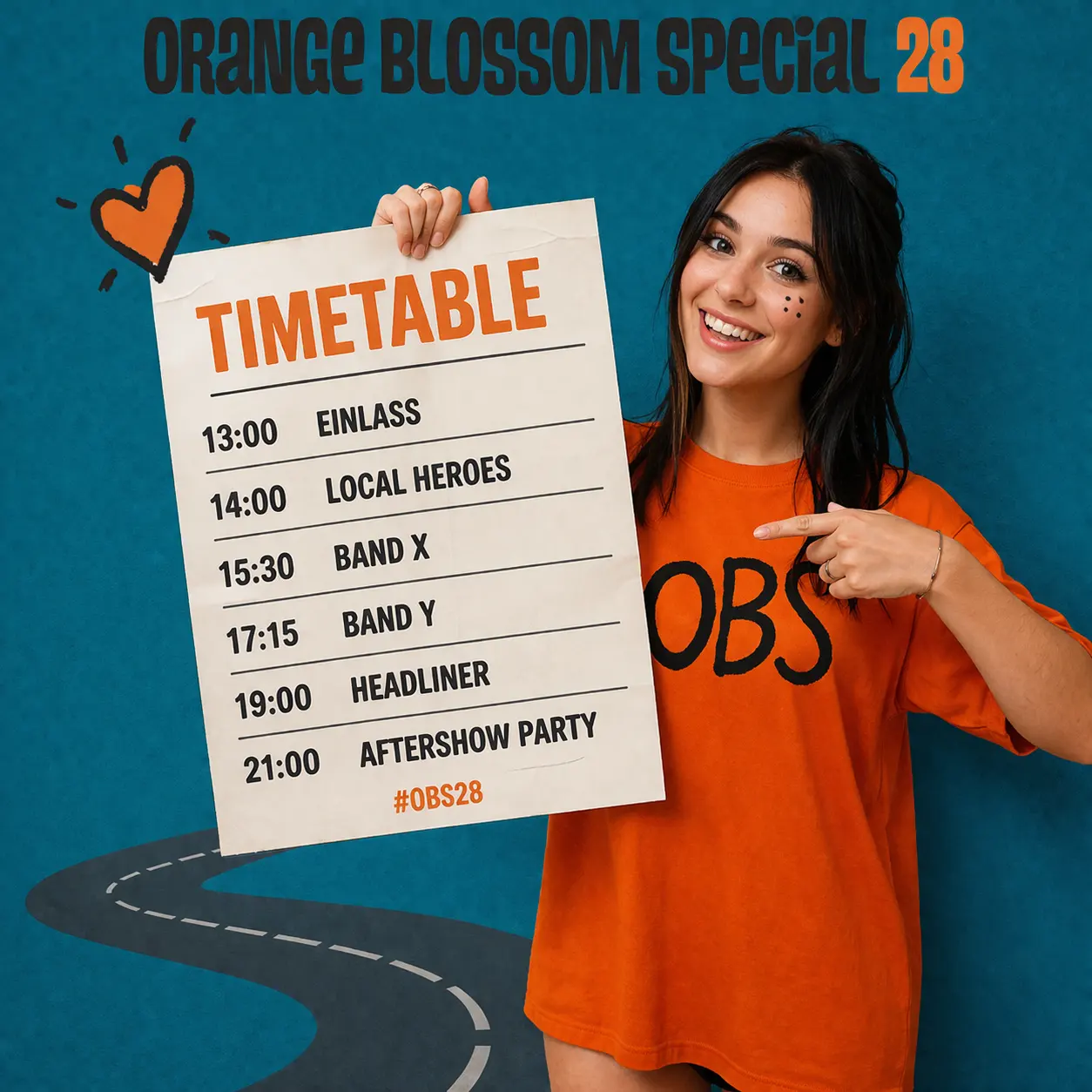 Orange Blossom Special 28: 22.–24. Mai 2026, Beverungen an der Weser. Der komplette Zeitplan mit allen Details steht auf der OBS-Website.