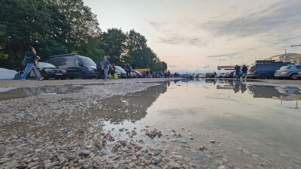 Des Rätsels Lösung: Die Bühne war noch gesperrt und die ungeduldigen Fans ausgesperrt - wahrscheinlich weil ein Tankwagen kurz zuvor noch einige der Pfützen aufsaugen wollte.