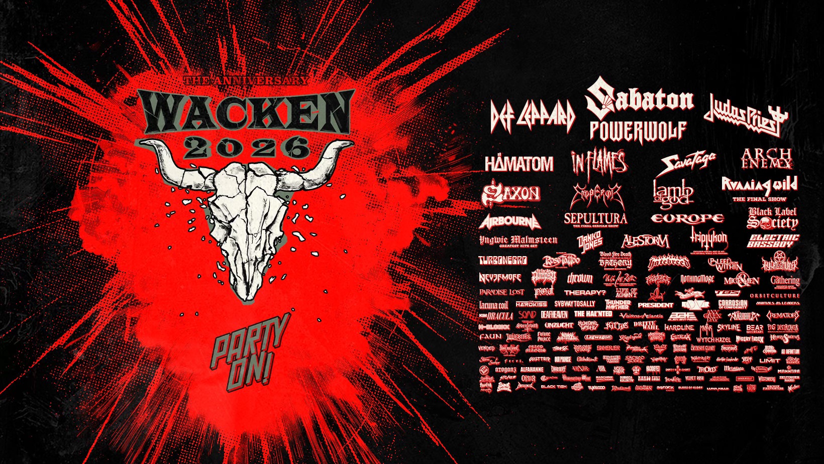 Das Wacken Open Air 2026 feiert sein 35-jähriges Bestehen und hat mittlerweile weit über 130 Bands im Programm. Die bisherigen Headliner sind Def Leppard, Judas Priest und Powerwolf. Dazu kommen Highlights wie In Flames, Savatage, Running Wild (mit ihrer Abschiedsshow), Sepultura (mit ihrem letzten Konzert in Deutschland), Arch Enemy, Lamb of God, Saxon, Black Label Society, Airbourne, H-Blockx und das DJ-Set Electric Bassboy von den Electric-Callboy-Jungs. Mit Sabaton bekommt das Line-up jetzt den Power-Metal-Act, der in dieser Aufstellung noch gefehlt hat.